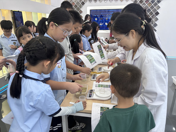 小记者们兴致勃勃地来到了中药数字化标本馆及智慧苗圃。他们在巨大的中药材标本墙前停住了脚步,一罐罐中草药标本栩栩如生,千年百草与现代科技交融辉映,仿佛在讲述中医药文化从涓涓细流到江河汇流的发展历程。工作人员耐心讲解了广陈皮、化橘红、广藿香等岭南道地药材的“前世今生”,带领孩子们开启了一场跨越时空的中医药文化之旅。
